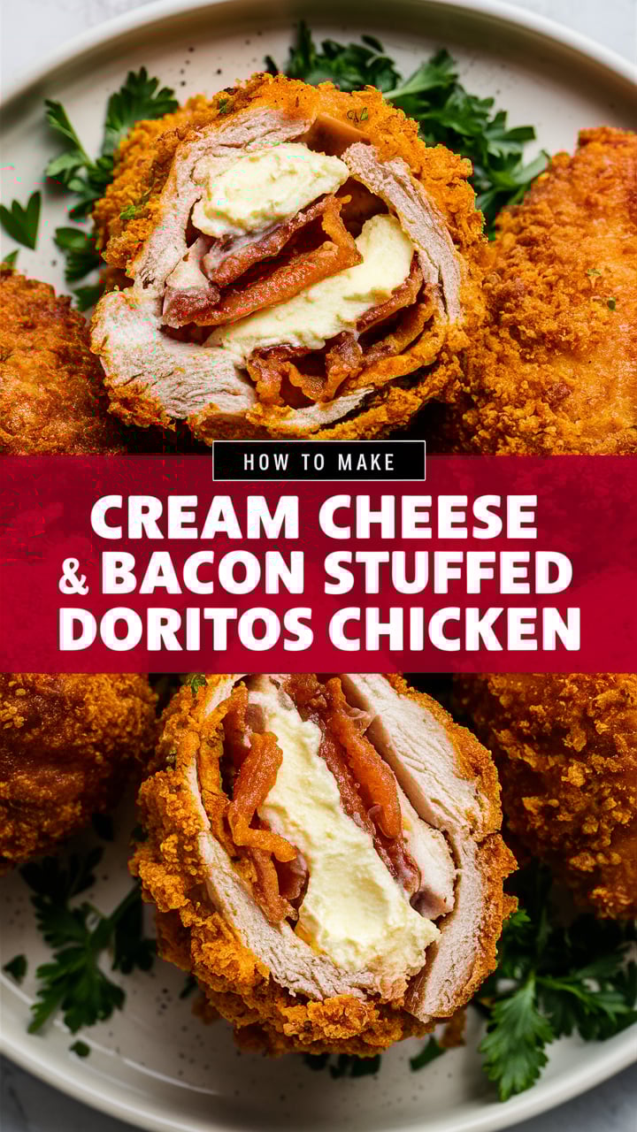 Cream Cheese and Bacon Stuffed Doritos Chicken isn’t just a meal—it’s an experience. From the crunch of the Doritos crust to the gooey, smoky, cheesy filling, every bite is satisfying and indulgent.