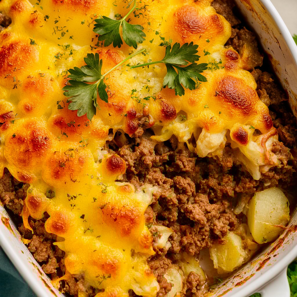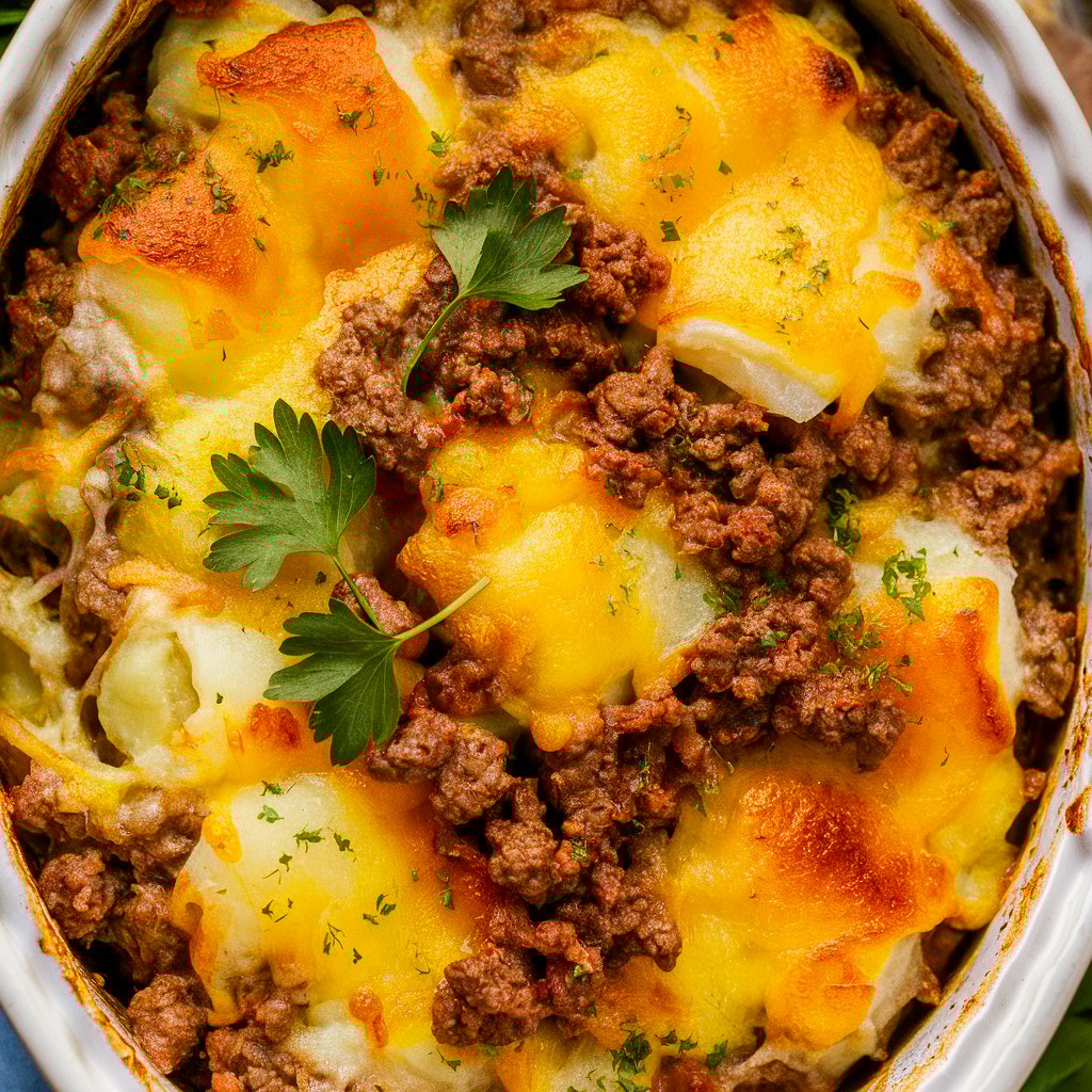 The savory star of the dish, ground beef provides protein, depth, and richness. Paired with onion, it creates the umami base that balances the creaminess of the sauce and cheese.